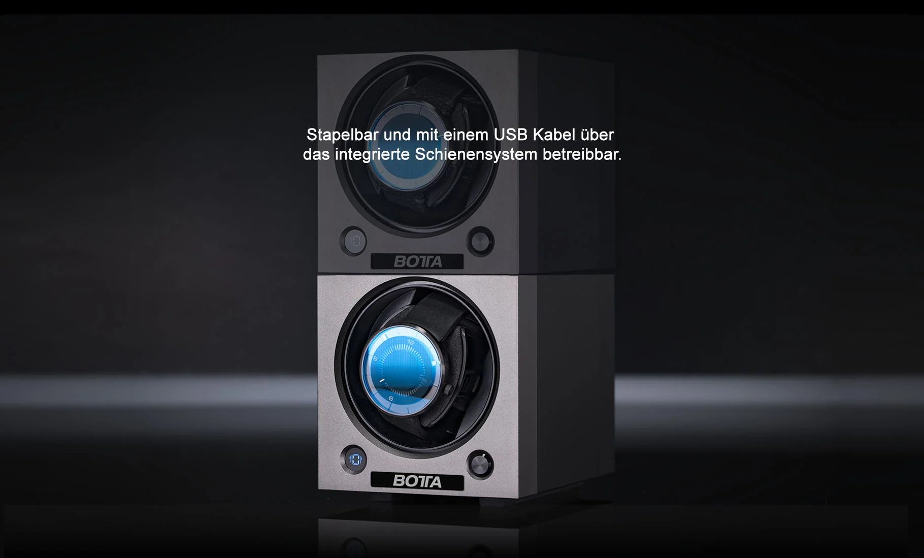 Der BOTTA Uhrenbeweger kann als Einzelmodul genutzt und über ein integriertes Schienensystem auf bis zu neun Module erweitert werden. Dabei werden die Geräte mechanisch vertikal verbunden und zentral über USB mit Strom versorgt. Die Bedienung erfolgt komfortabel über einen einzigen Taster.
